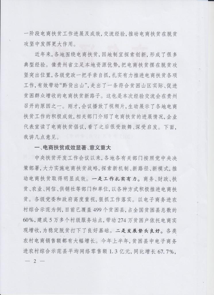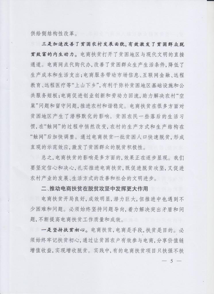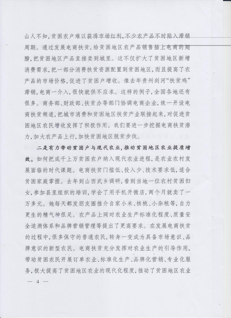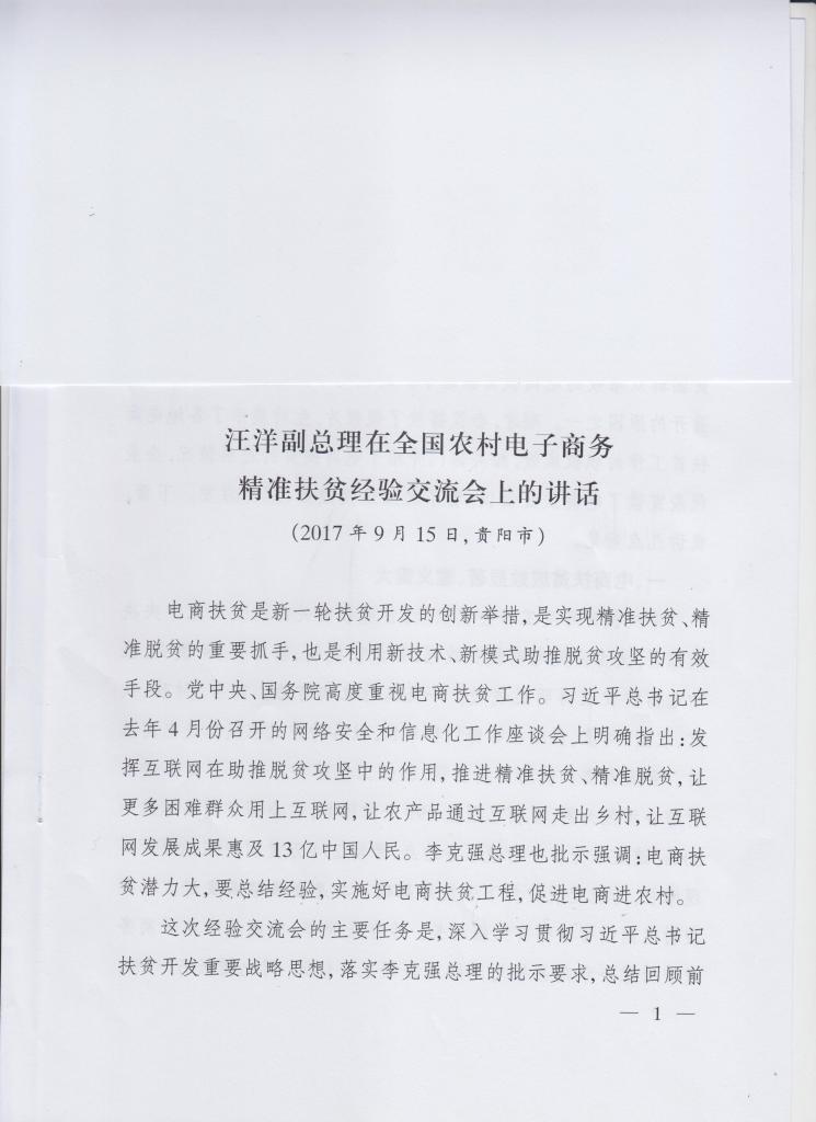 汪洋副总理在全国农村电子商务精准扶贫经验交流会上的讲话 2018年05月31日 11:31 点击:[ ] 上一条:习近平主持中共中央政治局会议 审议《乡村振兴战略规划(2018-2022年)》和《关于打赢脱贫攻坚战三年行动的指导意见》 下一条:商务部办公厅关于进一步完善电子商务进农村综合示范绩效评价工作机制的通知 【关闭】