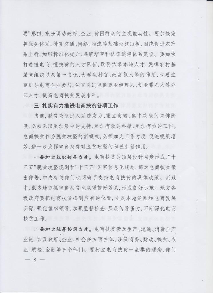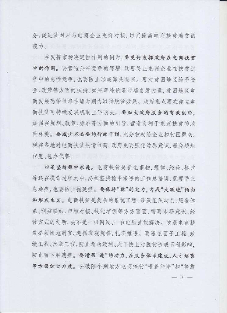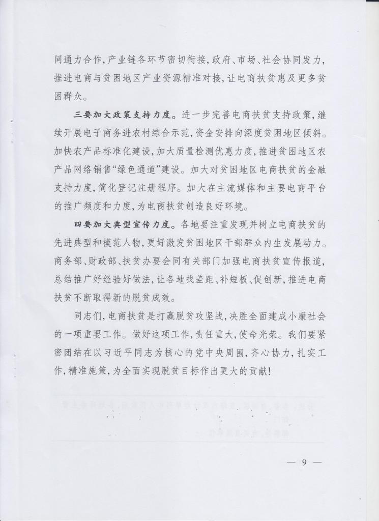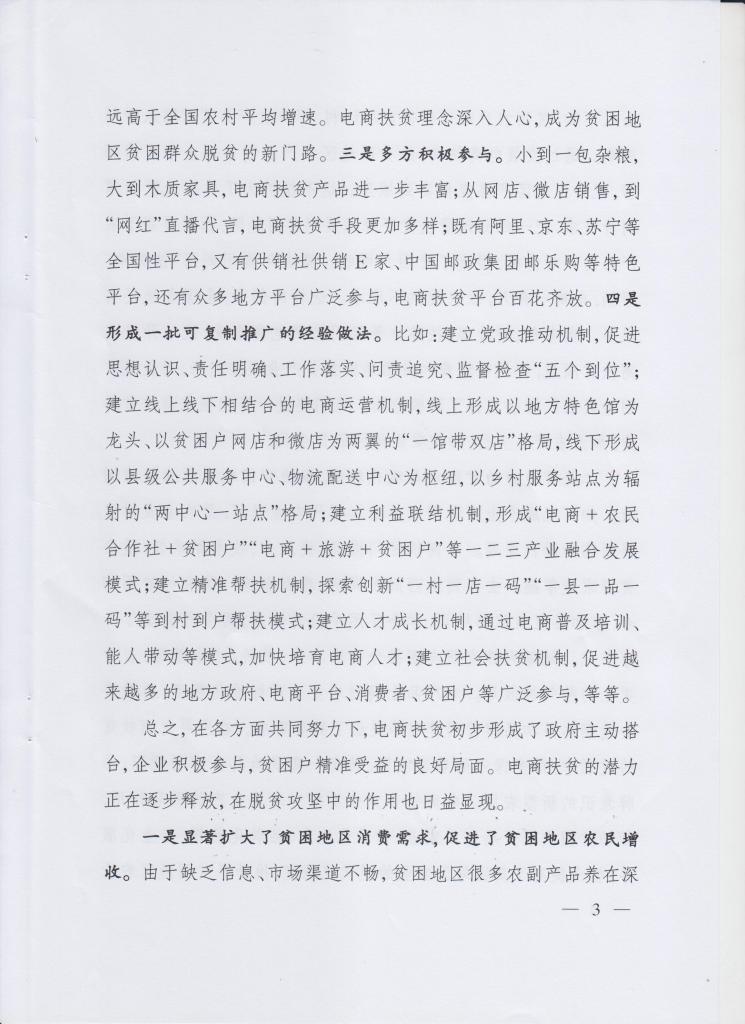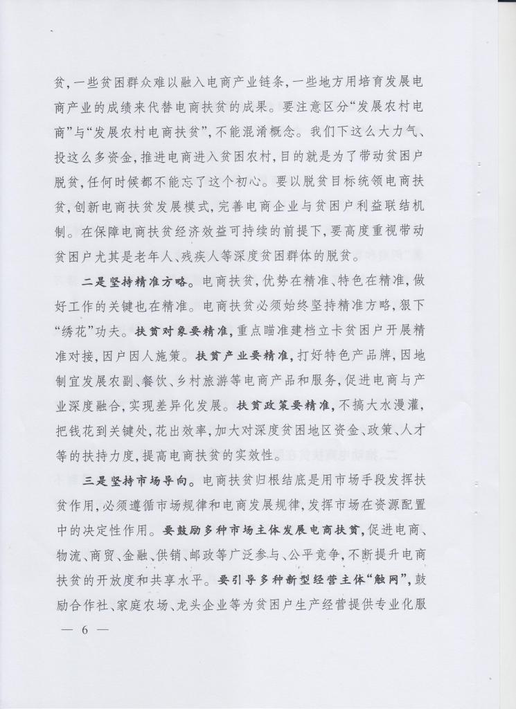 汪洋副总理在全国农村电子商务精准扶贫经验交流会上的讲话 2018年05月31日 11:31 点击:[ ] 上一条:习近平主持中共中央政治局会议 审议《乡村振兴战略规划(2018-2022年)》和《关于打赢脱贫攻坚战三年行动的指导意见》 下一条:商务部办公厅关于进一步完善电子商务进农村综合示范绩效评价工作机制的通知 【关闭】